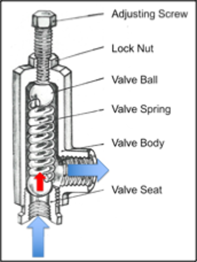 This PRV operates with a ball and seat arrangement and a compression spring. Fluid pressure acts on one side of the ball while the compression spring acts on the other.